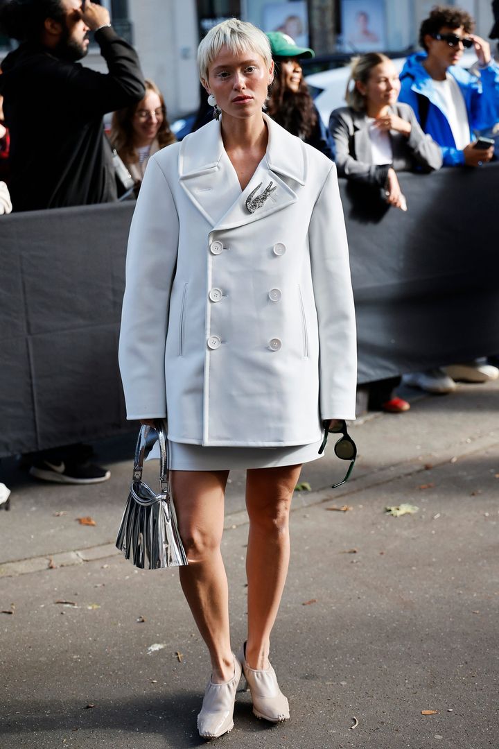 きちんと感のある上品ピーコートを、大きめサイズのブローチでちょっぴりモード×ラグジュアリーに味つけ。メタリックシルバーのバッグとの合わせ技もマネしたい。