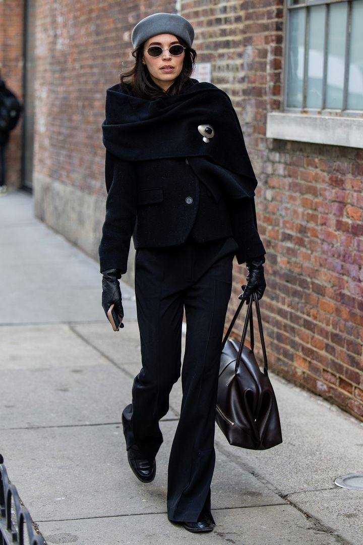 オールブラックの装いにストールを巻いた、都会派かつミステリアスなスタイリング。有機的なフォルムのブローチが、洗練された大人のアクセントとして効果的。
