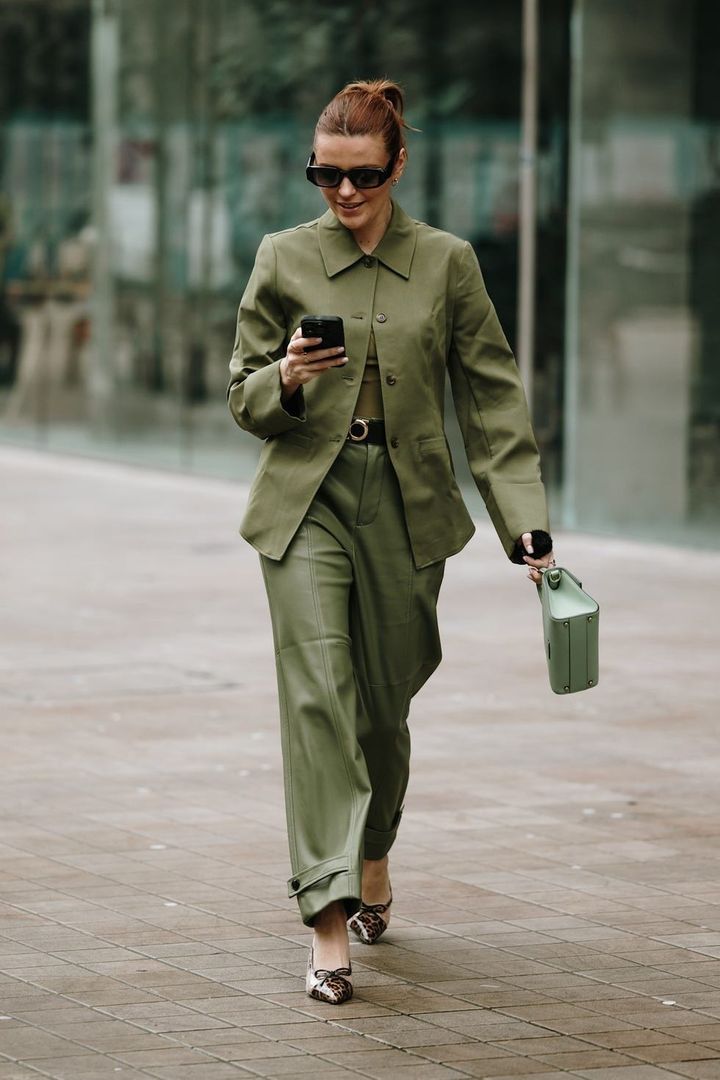 オリーブグリーンは、ワントーンでまとめることで都会的な洗練が引き立つ。ジャケットとパンツを同色でそろえつつ、インナーはあえてミニマルに抑え、色のニュアンスや素材感を際立たせるのがポイント。足元に柄や小物でさりげない遊びを効かせれば、力の抜けたエレガンスが完成する。