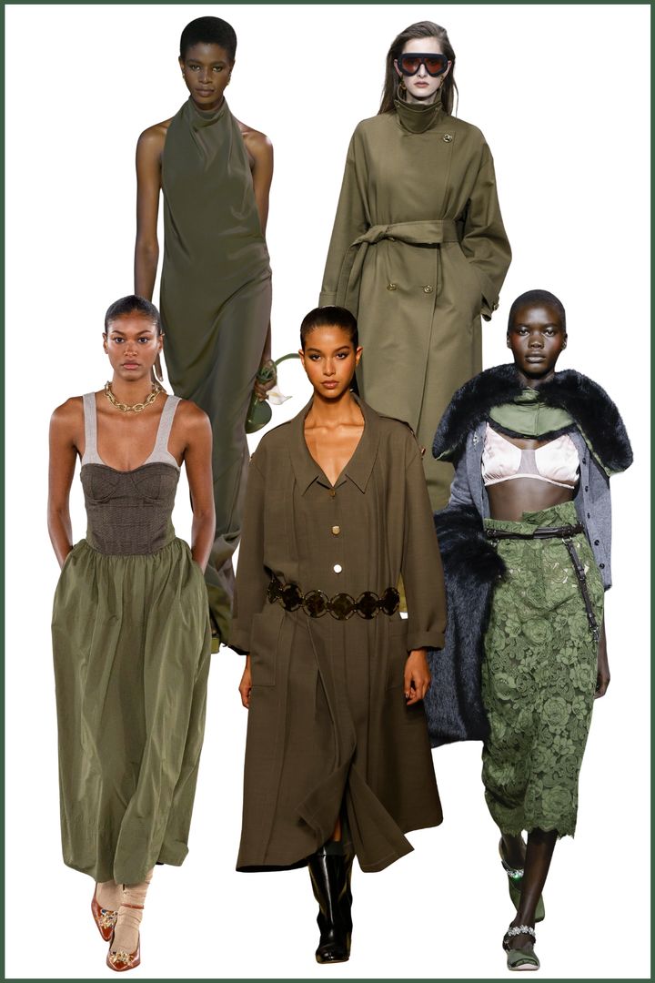 前シーズンに続き、今季もオリーブグリーンがランウェイで存在感を放った。アースカラーの延長として定着しつつあるこの色は、グリーンの爽やかさとブラウンの落ち着きを併せ持ち、装いに自然な深みとしゃれ感を添えてくれる。今季は本来ラフな印象の色をエレガントに昇華する提案が目立ち、「シモーネ ロシャ」ではセンシュアルに、「トリー バーチ」では端正に表現。さらに「ウラ ジョンソン」、「ジョセフ」、「カルト ガイア」では、ドレープやミニマルなシルエットを通してオリーブグリーンならではの奥行きが引き出されていた。