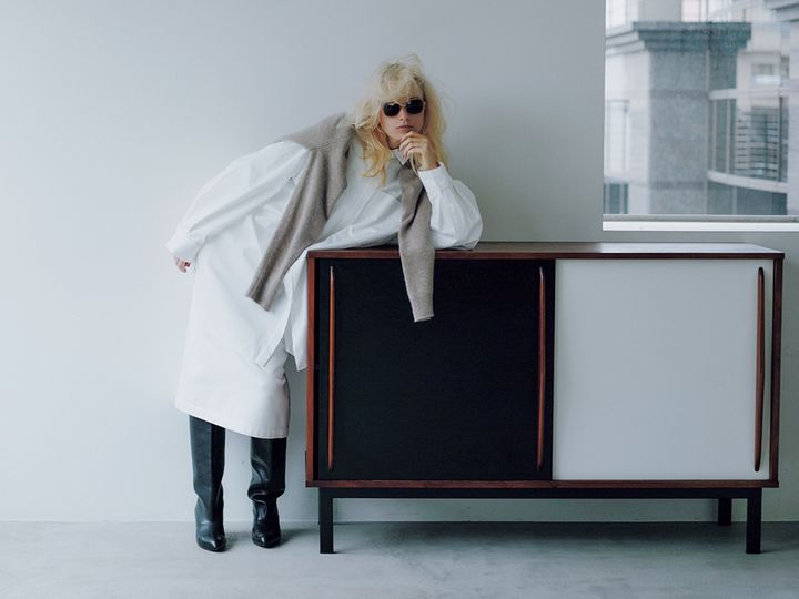ボリューミィなシャツの中に同色のワンピースをしのばせ、Iラインスカートに。動くたびにニュアンスの変わるカーディガンのそでが、ボタンを上までとめたシャツに遊び心を。