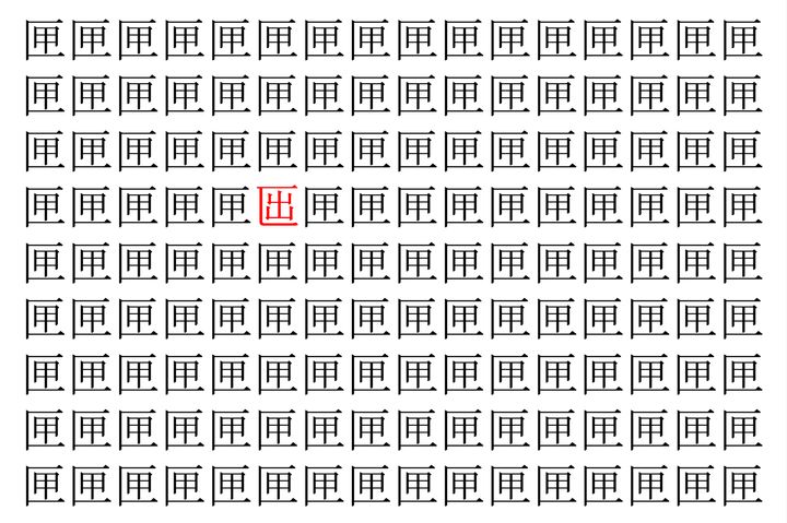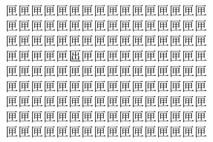 画像の中には、「匣」という漢字が縦に9行、横に16個並んでいます。 全部で144個となりますが・・・、そのうち1つは「異なる漢字」となってますよ!!