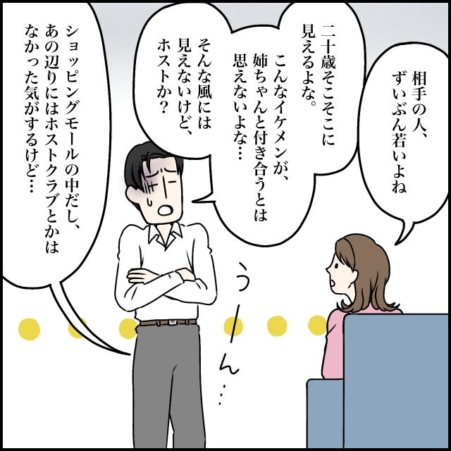 「相手の人、ずいぶん若いよね」私がそう言うと、太一も同じことを考えていたようで「20歳そこそこに見えるよな、こんなイケメンが姉ちゃんと付き合うとは思えない・・・そんな風には見えないけどホストか?」と首をかしげました。しかし、たとえ同伴だったとしても、場所はショッピングモールの中。あの辺りにホストクラブがあった記憶もなく、ますます状況が分からなくなってしまいました。