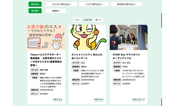 東京アプリ内には、学びや新しい発見につながるイベントが数多く紹介されています。物価高騰が続く中、ポイントを得られればちょっとお得な気持ちになれそうです。防災イベントやボランティアなどに参加して、ポイントを獲得してみてはどうでしょうか。