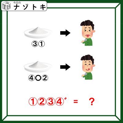 男性のリアクションから考えると上の粉はしょっぱそうですね。また、2文字であるということから「しお(塩)」であることが推測できますね。また、下は美味しそう顔をしており、3文字です。そこから塩との対比でもある「さとう(砂糖)」であることが推測できます。