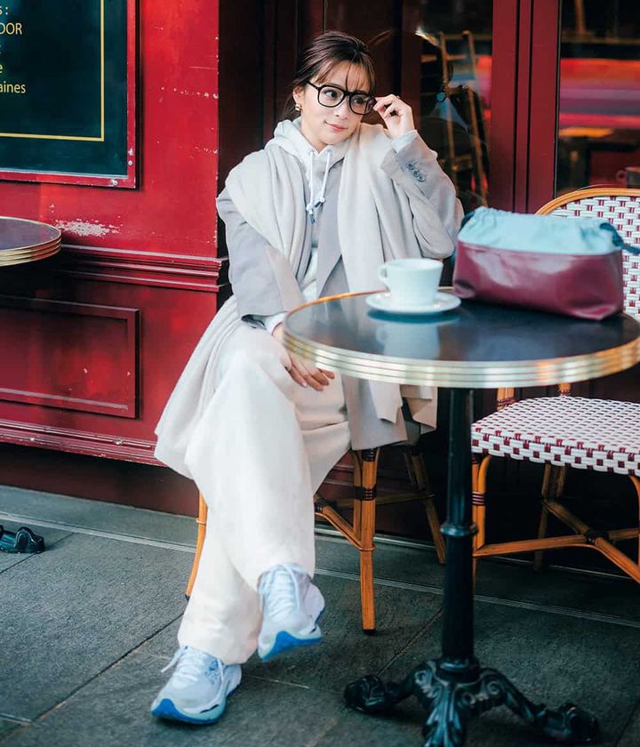 ジャケット¥67,100(フミエタナカ/ドール)パーカ¥35,200(ハイク/ボウルズ)パンツ¥50,600(エブール/リトルリーグ インク)バッグ¥145,200(ピエール アルディ/ピエール アルディ 東京)スニーカー¥27,500(ホカ®/デッカーズ ジャパン)メガネ¥23,800(カリン/STARDREAM JAPAN)ストール¥63,800(アソース メレ/アイネックス)ピアス¥34,000 (ブランイリス/ブランイリス トーキョー)リング¥105,600(マユ/マユ ショールーム)