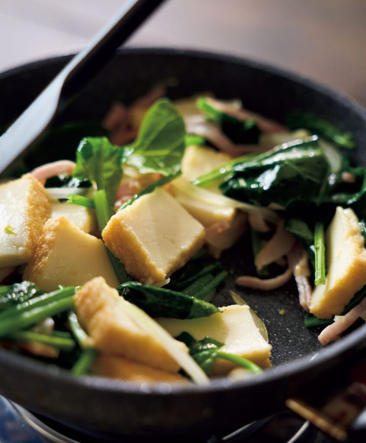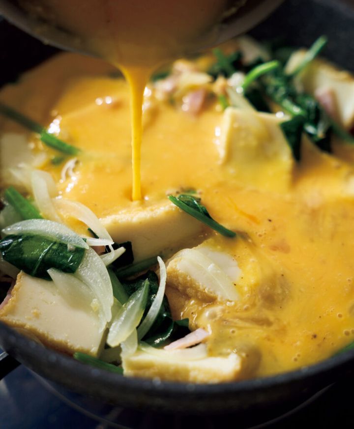 卵との相性がいい厚揚げは、実はスペイン風オムレツにもぴったり。こんがり香ばしく焼き上げれば、ほくほく食感がアクセントになって、思わずうなるおいしさです。