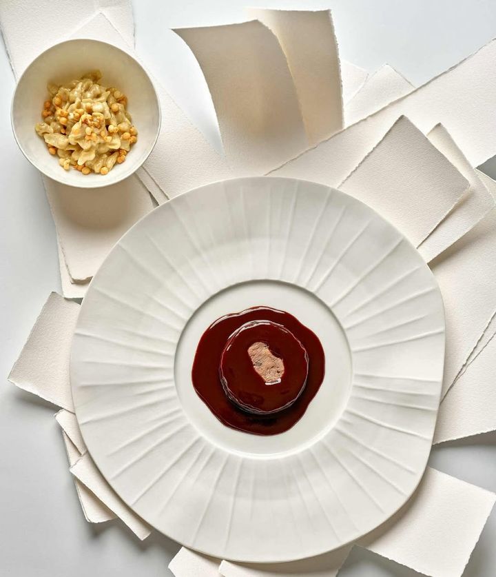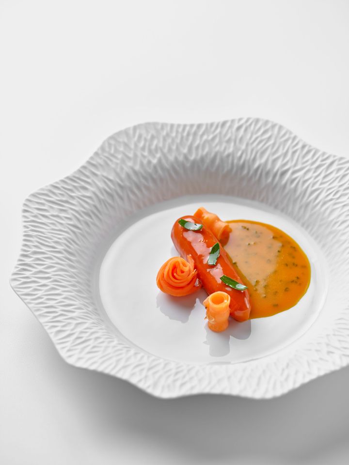 また、海外の食文化にも興味を持ち、例えば日本ならオマール海老の火入れに備長炭を使ったり、鴨肉は塩と蜂蜜、日本酒でマリネしてから焼き上げたり、メキシコのタコス作りのためのテクニックである石灰処理の手法で人参などの野菜をもっちりと仕上げた料理など、新たな挑戦をしながら伝統を革新しています。
