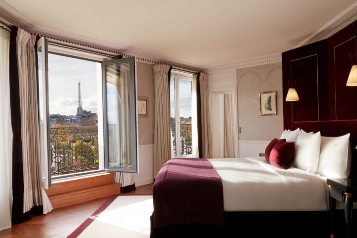 エレガントな建物は、1854年にナポレオン3世の異父弟、シャルル・ド・モルニー公爵と家族のために建てられたもので、その後、デザイナーのピエール・カルダン氏の邸宅として使われていた時期もあったそう。2015年のホテルの開業に合わせ、あのジャック・ガルシア氏が改装を手がけ、赤を基調としたエレガントな内装になっています。