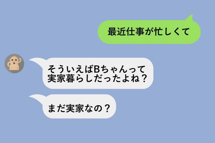 「そういえばBちゃんって実家暮らしだったよね?まだ実家なの?」。 「まだ」という言葉が引っかかりました。まるで遅れているみたいな言い方。