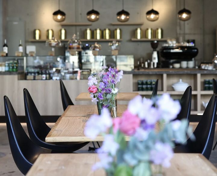 2023年のリニューアルでさらに洗練された店内には、美しい木目のテーブルに季節の鮮やかなフラワーアレンジメントが飾られています。