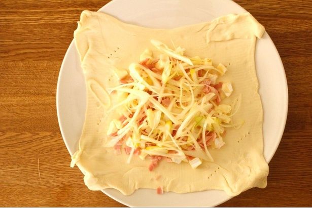 レシピといっても基本は材料をのせて焼くだけなので、ポイントといえば、パイの形を整えることでしょうか。パイシートをめん棒でのばし、フォークで数ヶ所穴をあけます。具をのせたらパイの角を丸く切り落とし、ひだを寄せながら包んでいきました。仕上げとして、表面に溶き卵を塗り、オーブンへ。20分程度で焼き上がりました。