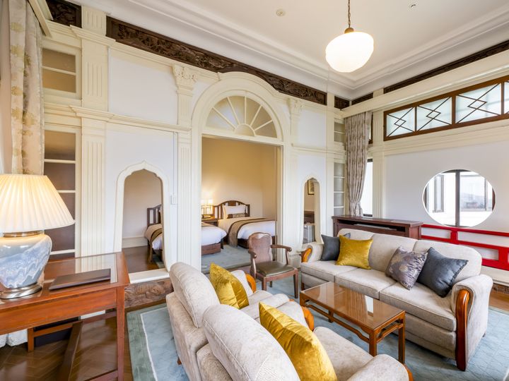 1878年、日本初の本格的リゾートホテルとして箱根・宮ノ下に誕生した富士屋ホテル。敷地内には、「本館」「西洋館」「花御殿」「フォレスト・ウイング」という、それぞれに味わい深い4つの宿泊棟が立つ。その中でも最も長い歴史を誇るのが「本館」。その社寺造りの外観に目を奪われつつ、館内に入ると開業当初の様子を思わせるクラシックなロビーフロアが現れる。格調高くも、ゆったりと安らげる空間。洋風の意匠を基調にしながら日本伝統のディテールが散見される印象は、客室まで続く。