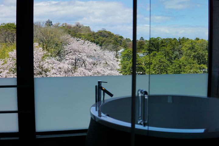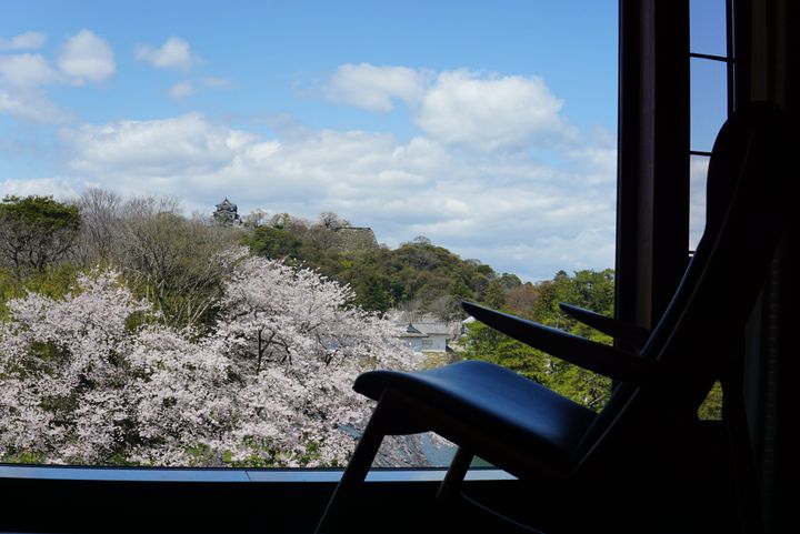 52室を数える客室の中で、特に「スーペリアツインルーム」や「キャッスルビューツインルーム」では、大きな窓から、桜に彩られた城の景色が飛び込んでくる。また、天守眺望の大浴場「城見の湯」では、ライトアップされた眺めを満喫しながら旅の疲れを癒したい。