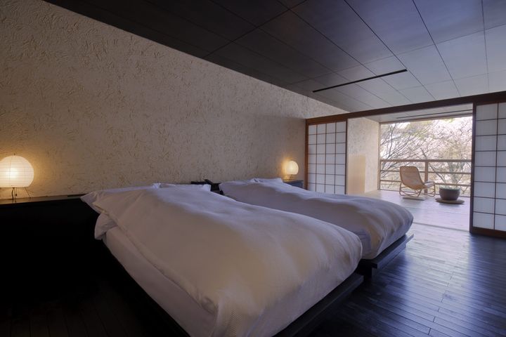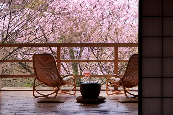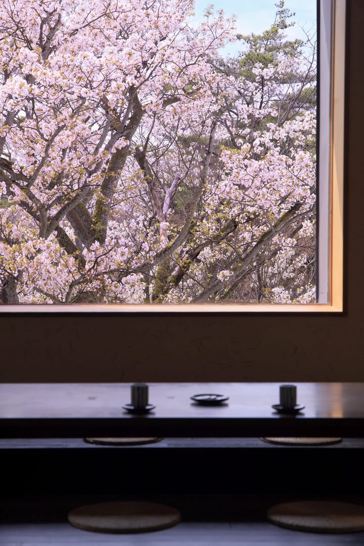 広さ120㎡を誇る「特別室 若紫」は、樹齢百年を超える山桜の大木を正面に望み、大きく開け放たれた開口部からは、花びらが室内に舞い込む。