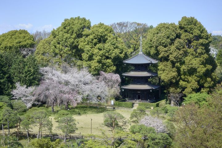 品川駅から徒歩3分ほどと、アクセス抜群のザ・プリンス さくらタワー東京の目の前には、約2万㎡の日本庭園が広がる。そこは、都会の喧騒から解き放たれた豊かな緑の空間。港区の有形文化財に指定された観音堂や鐘楼、山門を有する園内の花木は、四季折々の表情を見せる。春の見どころは、なんといっても17種約210本の桜だ。