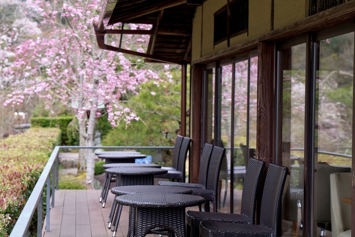 スイートルーム4室を含む17室には露天風呂があり、敷地内の桜を眺めながらゆったりと過ごすことができる客室も。このほか、築120年超の明治期の建物を改装したレストラン「京 翠嵐」や、1910年に建てられた茅葺屋根の庵の名残を感じるカフェ「茶寮 八翠」(写真)でも桜の景色が眼前に広がる。