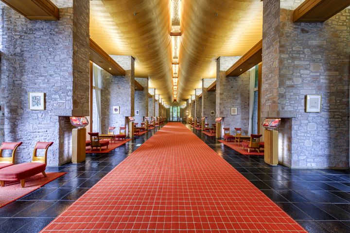 <写真>曲面を描く天井がドラマチックなロビー。窓際には、村野がデザインした“スワンチェア”が置かれている。