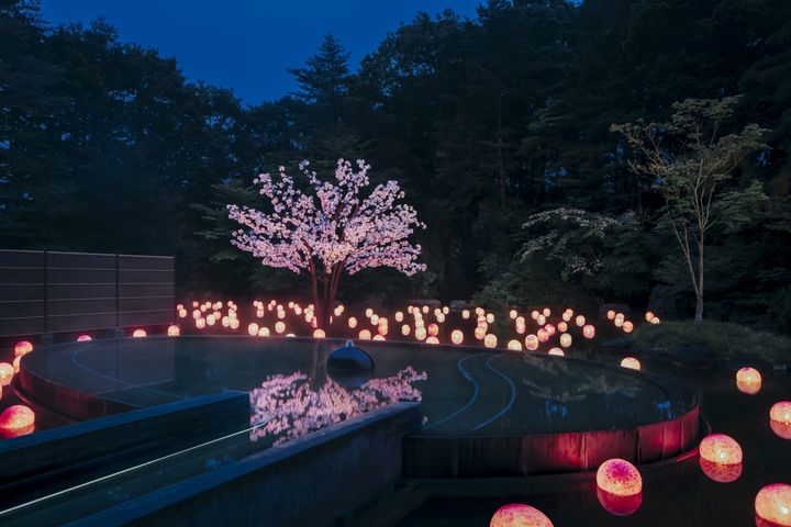 期間中は、花見露天も楽しめる。露天風呂「浮湯」の周りの池に、こちらもねぶたの技法を用いた満開の一本桜が立ち、水面には津軽びいどろの浮玉が浮かぶ。夜はライトアップされるので、幻想的な景色を眺めながら、日々の雑事を忘れ、非日常を味わいたい。