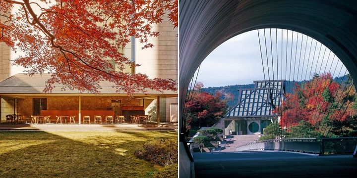 村野藤吾が87歳で設計した、ザ・プリンス 箱根芦ノ湖。エントランスやロビーを含む矩形の主棟と円形の客室棟の2棟で構成される。村野は建設時、森林の樹木1本に至るまで管理を徹底。バルコニーの曲線や雨どいのフォルムなどディテールにもこだわり、周囲の環境に溶け込む名建築を完成させた。