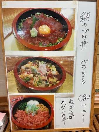 鮪の漬け丼、バラちらし、ねばねばネギトロ丼の3品がなんと1,200円。 「鮪が美味しい!」と思わず声が出ちゃったら、「マグロは南インドマグロにこだわっています」と店主の渡邉勝治さん(69)。