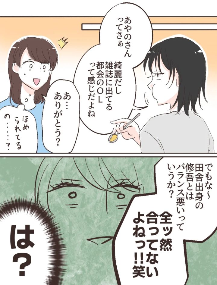 その後も、「あやのさんってさぁ、綺麗だし雑誌に出てる都会のOLって感じだよね」と言われたので「あ・・ありがとう?」と一応お礼を伝えると、「でもな~、田舎出身の修吾とはバランス悪いっていうか?全ッ然合ってないよねッ!!」と大笑いする智美さん。は?結婚の顔合わせの場で「合ってない」なんて普通言う?言わないよね??