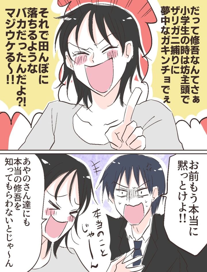 智美さんは周囲の気まずい空気などお構いなしに「だって修吾なんてさぁ、小学生の時は坊主頭でザリガニ捕りに夢中なガキンチョでぇ、それで田んぼに落ちるようなバカだったんだよ?!マジウケる~!!」と修吾をけなして大笑い。修吾は必死に怒りを堪えながらも「お前もう本当に黙っとけよ!!」と智美さんに注意しますが、智美さんは「本当のことじゃーん」と受け流し、「あやのさん達にも本当の修吾を知ってもらわないとじゃ~ん」と笑い飛ばします。自分は修吾の本当の姿を知ってるけど、私は知らないってこと?え?それ、マウントですか?