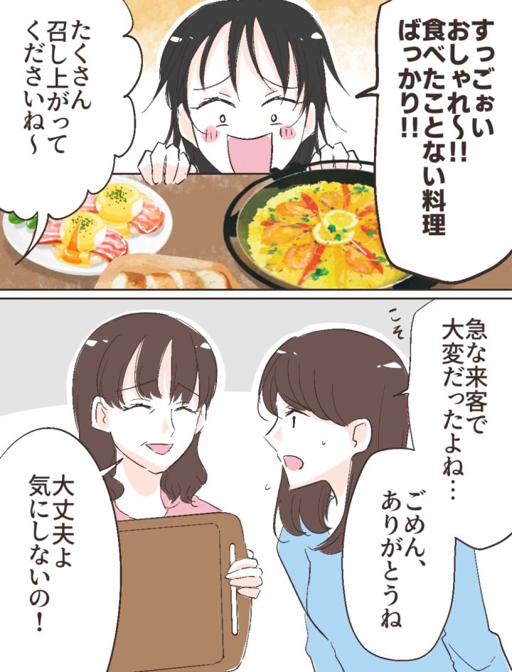 挨拶を終えた私たちは、一緒に食事をとることに。母が腕をふるってくれ、テーブルには華やかなご馳走が並びました。「すっごぉい!おしゃれ~!!食べたことない料理ばっかり!!」と目を輝かせる智美さんに、母が「たくさん召し上がってくださいね~」と笑顔で言いました。どれも手の込んだ料理で母が時間をかけて準備してくれたことがわかりました。「急な来客で大変だったよね・・。ごめん、ありがとうね」とこそっと声をかけると、「大丈夫よ。気にしないの!」と笑顔で言ってくれた母。本当に感謝しかありません。