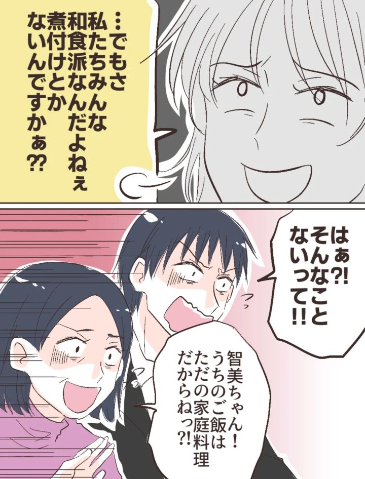 みんなが席につき、和やかな雰囲気で食事が始まったのですが・・またしても智美さんの一言で場の空気は一変。テーブルに並んだ母の手料理を前に「でもさ、私たちみんな和食派なんだよねぇ。煮付けとかないんですかぁ??」とため息まじりで智美さんが言ったのです。智美さんの発言に修吾も義母も大慌てで「はぁ?!そんなことないって!!」「智美ちゃん!うちのご飯はただの家庭料理だからねっ?!」と洋食を作ってくれた私の母をフォローしてくれました。