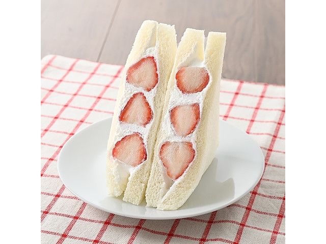 熊本県産「ゆうべに」を使用したいちごサンドです。いちごとホイップクリームのシンプルなサンドイッチです。 ※宮崎県、鹿児島県では取り扱いがございません。 九州で販売