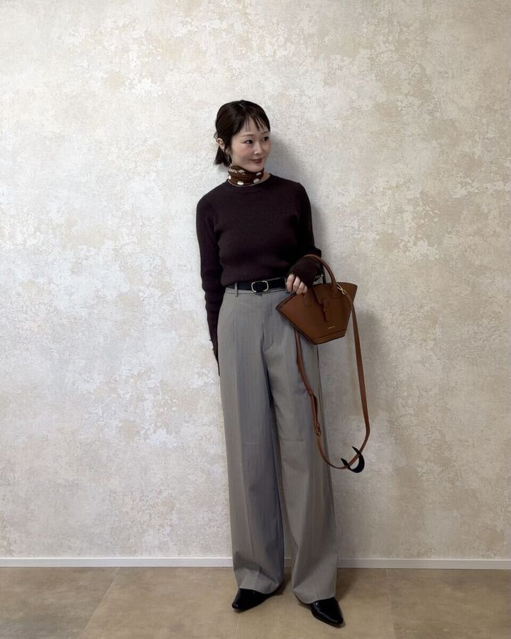春も注目のブラウンニットを合わせたコーデ。ドットスカーフをポイントにしてみました。トップスはパンツにイン。さらにベルトでウエストをマークして、きちんと感を意識した着こなしに。やわらかなライトグレーのパンツが重たくなりがちなブラウンコーデを軽やかに見せてくれます。足元は黒のポインテッドトゥでシャープさをプラスし、キャメルバッグで統一感を出して大人っぽくまとめました。