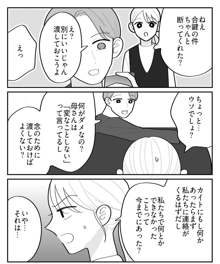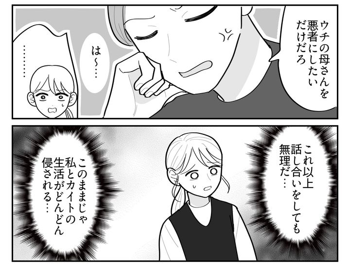 私にとっては、他人が自由に家を出入りするのと変わらないのに……! ヨシハルは受け入れられない私の方がおかしいという態度です。「結局はウチの親を信用していないんだろ」ため息をつきながらそう言い放ちました。
