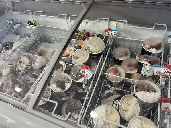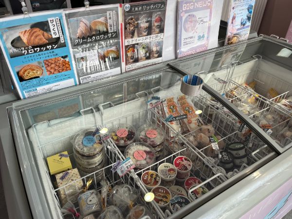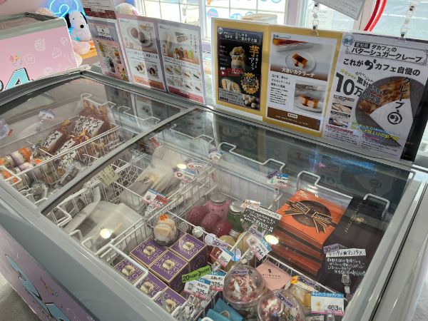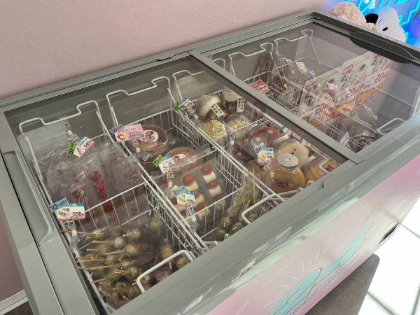スーパーやコンビニでは見たことのない、全国の変わり映えしたスイーツが豊富に揃っています。 フルーツ飴やロールアイス、パフェ缶、クレープ、和菓子など、本当に様々なスイーツがあり、どれを買おうか迷ってしまいます。全て冷凍の状態で販売されています。