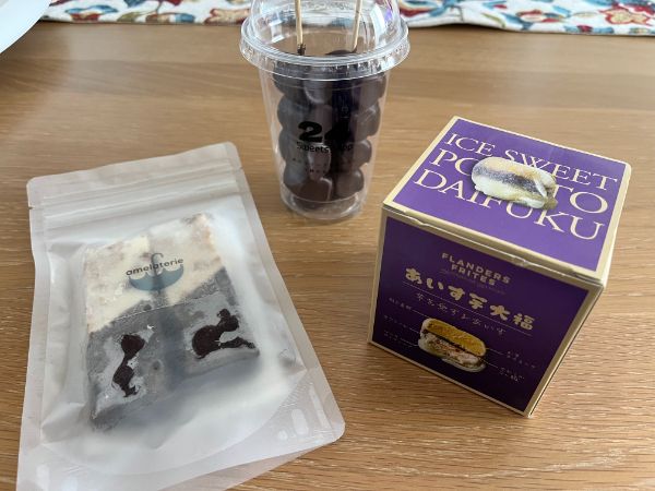 今回は、ヌガーショコラと芋大福を購入。 ちょうど3周年イベントの開催中で、チョコ掛けマシュマロをプレゼントしていただきました。
