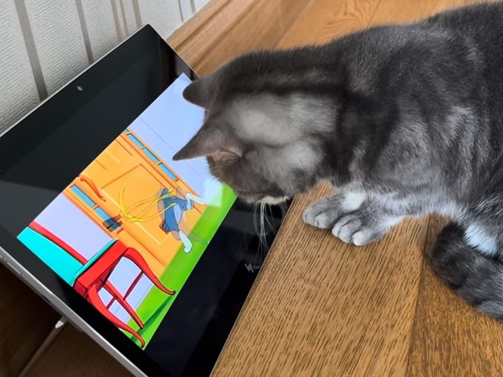 3. 追いかけっこに反応して体が動いちゃう!アニメに夢中な猫さんのワクワクした反応が可愛い