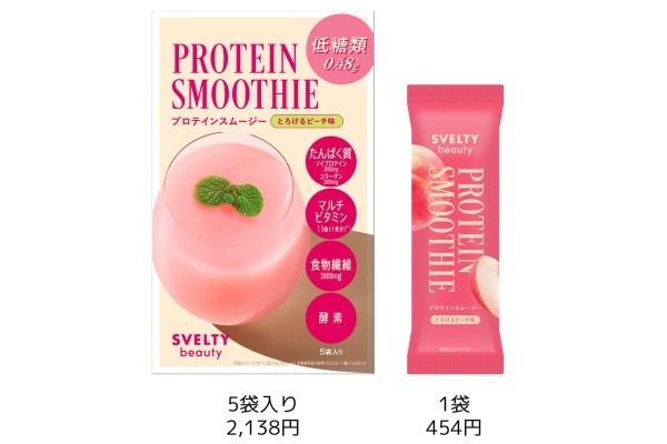 商品名:プロテインスムージー アサイー&ベリー味、プロテインスムージー とろけるピーチ味 価格:5袋入り:2,180円、1袋:454円 発売日: 先行発売/3月1日から順次(ネイチャーラボ公式ストア、Qoo10、Amazon、バラエティショップ) 全国発売/4月1日から順次