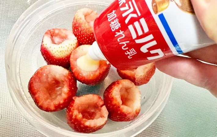 2.くり抜いたイチゴを容器に並べ、練乳を注ぎ入れる