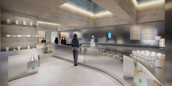 「ブルーボトルコーヒー 原宿カフェ」のコンセプトは、「街の記憶と未来を繋ぐ」。空間デザインを手がけたのは、「TEKI DESIGN(テキ デザイン)」の西永竜也氏だ。デザインの象徴となるのは、天井やカウンターに配された鈍い輝きを放つステンレスのファサード。通りを行き交う人々や、日々移ろう街の表情を抽象的に映し込み、外の気配をそのままカフェの内側へと引き込む仕掛けだ。また天井には淡い青色の反射素材を配し、まるでビルの谷間から見上げる青空のような開放感をもたらす。