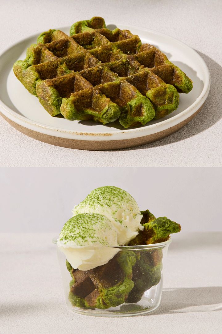 スイーツも見逃せない。ブランド創業時から人気メニューでもある「リエージュ ワッフル」の、初のフレーバー展開として抹茶が登場(写真上)。北海道産小麦粉とバター、バニラペーストを合わせた生地に、京都の老舗茶問屋「利招園茶舗」の抹茶を練り込んだ。程良い苦みと生地のやさしい甘みが心地よく、表面にトッピングしたシーソルトが抹茶の輪郭をより鮮明に引き立てる。さらに、ミニサイズに焼き上げたワッフルと、ミルクアイスを合わせた「ワッフルパフェ 抹茶」(写真下)もおすすめ!