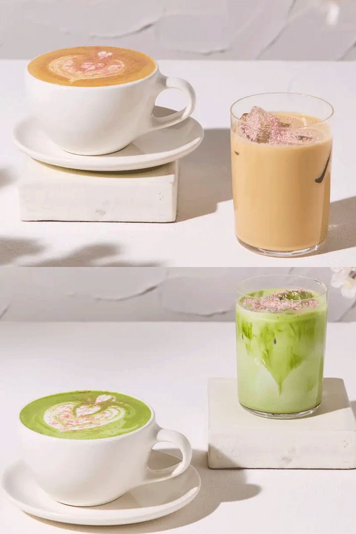 また、期間限定で登場する「チェリーブロッサムラテ」(写真上)と「抹茶チェリーブロッサムラテ」(写真下)も要チェック。チェリーブロッサムシロップを合わせ、桜の華やかな香りと繊細な味わいをラテで表現している。