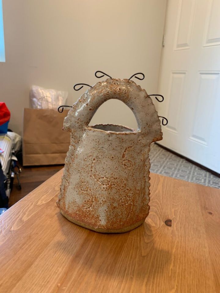 しかし題に「花器」と書いたものの、これはそう呼ばれてこなかったんじゃないか。取手らしき部分には、ぐるり伸びた毛のような針金の造形があるので下手に掴めない。これまでの持ち主も、釣り鐘のような下部を支えるようにして持ち運んだのでは、そんな様子が想像できる。顔を近づけると、側面に針金と似たかたち(「g」あるいは「6」「9」「q」のような)が引っ掻いてうすく刻まれていることに気付く。引いて見ると、足をもがれたイカのようにも見える。