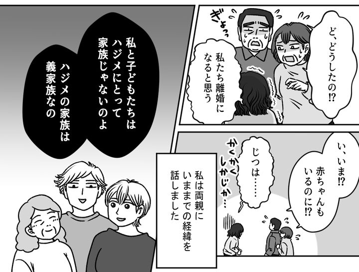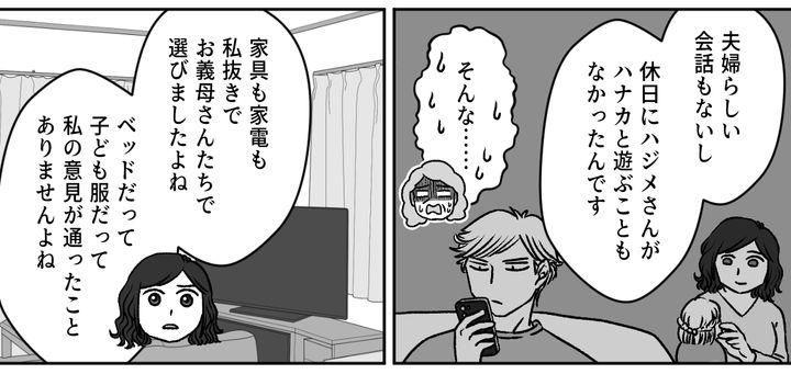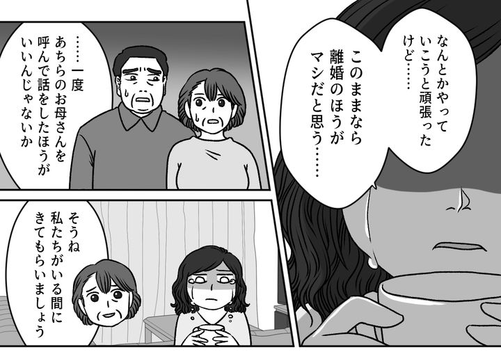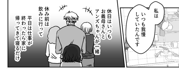 両親が義母に電話をすると、焦った義母とバツが悪そうな旦那、アンズちゃんが急いで家にやって来ました。私は旦那が平日は帰宅したらすぐに寝てしまって、休みの前日は飲みに行ってしまい遅くまで帰ってこないこと、週末は当たり前のように義母とアンズちゃんと過ごすこと、不満という不満をすべて打ち明けます。義母はまったく自覚がなかったのでしょう。私の話を驚いた顔で聞いていました。