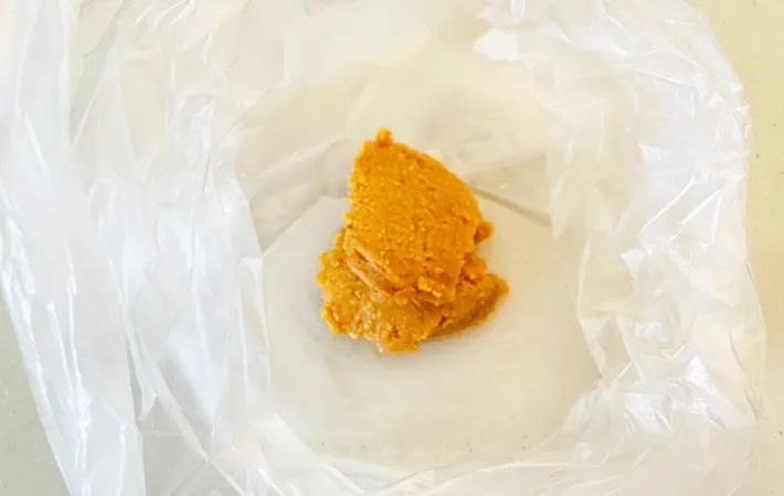 耐熱ポリ袋に、酒、砂糖、みりん、味噌を入れて、袋の上から揉み込むようにして混ぜます。