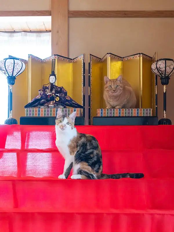 そして、男雛と『女雛』の間にやって来たのは、同じく愛猫のモモちゃん。2匹そろって、とっておきのすまし顔を見せてくれました!