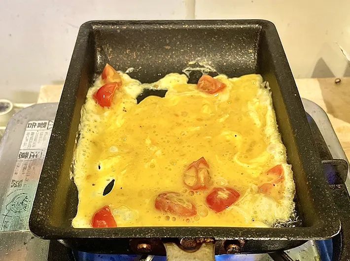 まず、ボウルに卵を割り入れ、白だしとカットしたミニトマトを加えます。