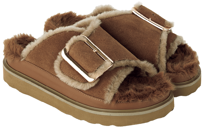 ムートンならサンダルだってあったか。厚手のソックスと一緒に。サンダル¥23,980(MOHI/ピモンテ)