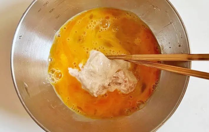 ボウルに2個の卵を割り入れて少し混ぜたら、先ほど作ったツナマヨを加えます。