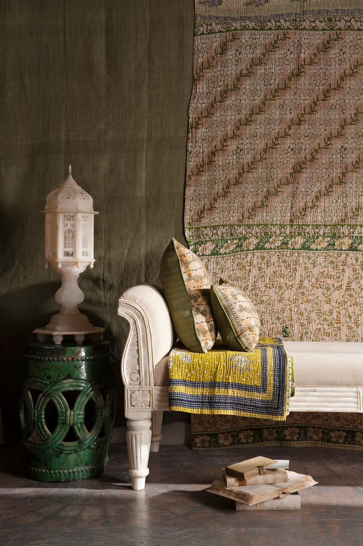 彼は、アンティークの布が持つ優れた色彩、質感、デザインに細かく注目したうえでコーディネートに組み込み、他のアイテムと共に空間のバランスを整えることを提案している。たとえば、アンティークの布に落ち着いたグリーンの刺繍や、鮮やかなマリーゴールド色の手仕事が施されているなら、その色をクッションやソファの生地にも取り入れてみる。