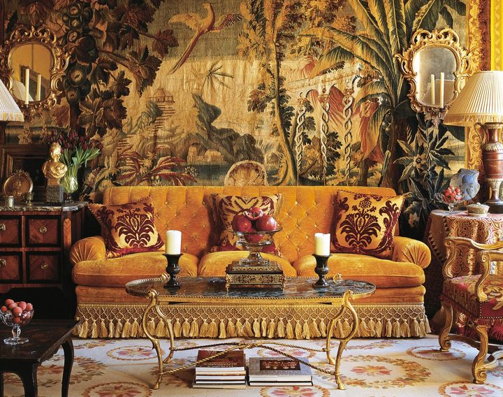 部屋をデザインする際、彼はソファや椅子の生地を新調することはあっても、テーブルクロスにはあえてアンティークの布を調達するという。「そうすることで、部屋の格調が一気に高まるんです。何世代にもわたって受け継がれ、長い年月をかけて作り上げられてきたような、深みのある空間が生まれます。ほんの数枚でいいのです。アンティークのテキスタイルを取り入れるだけで実現できます。しかも、大した手間をかけることなくね」