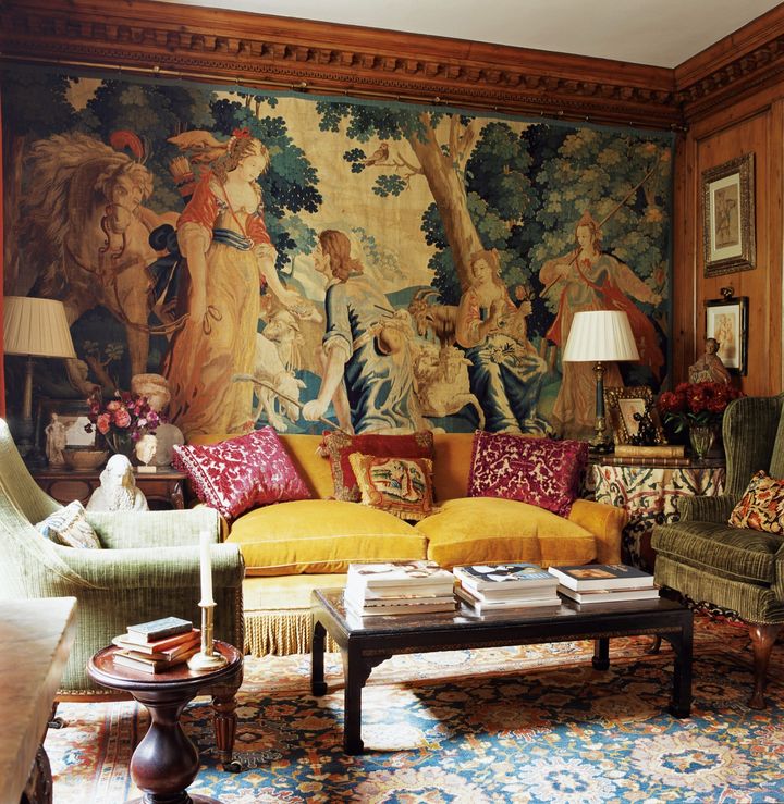 大きなアートを飾るのと同様に、大判のテキスタイルを飾ることに気後れしてしまう人は多いが、実はそれが空間に美しさと調和をもたらす素晴らしい選択肢になると彼は指摘する。ソファやテーブルの背景にアンティークのタペストリーを掲げることで、部屋全体のスケール感が引き上げられ、より壮大でバランスの取れた空間に仕立て上げることができるという。